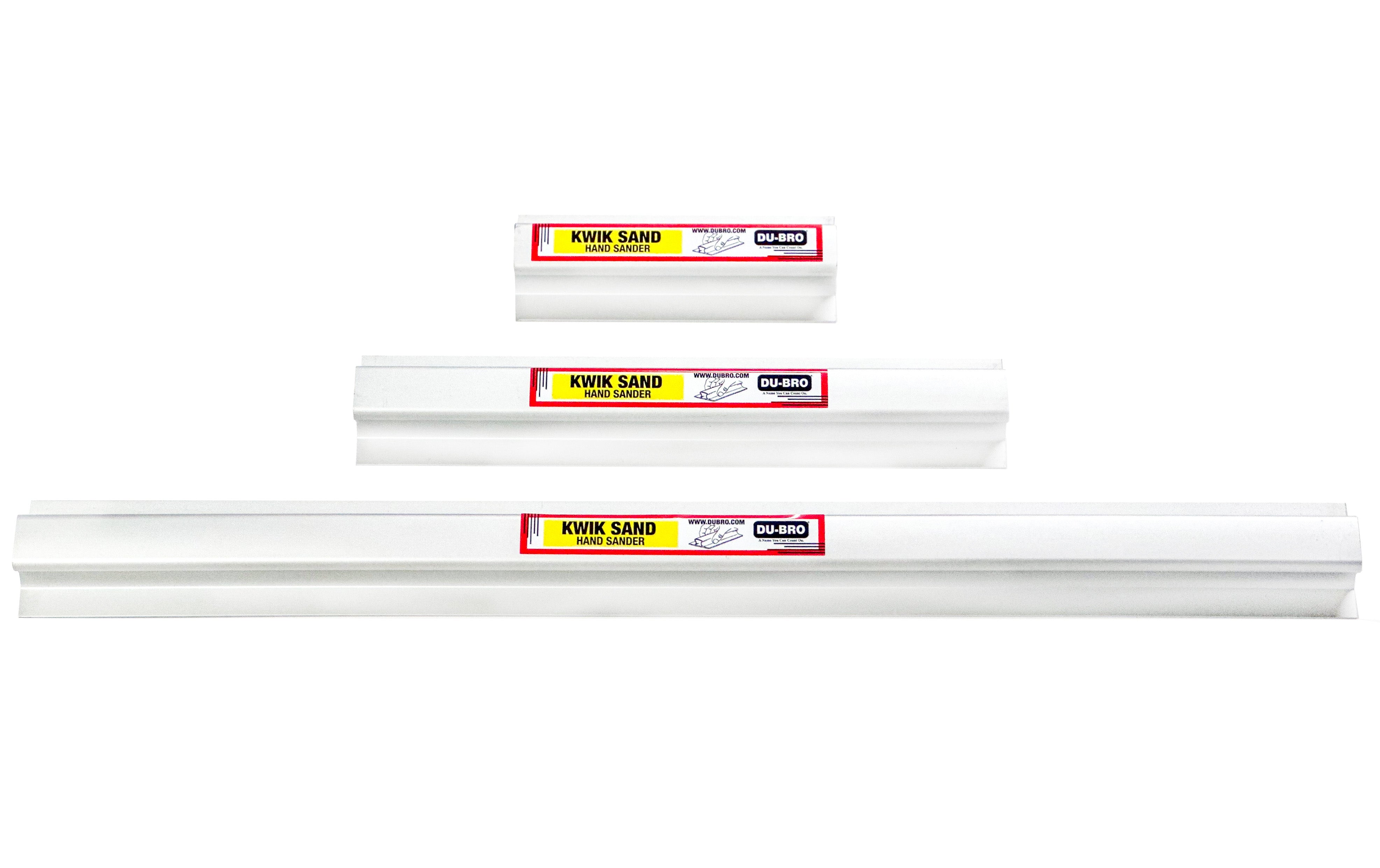 Kwik Sand hand sanders are available in 5.5” (Part 3400-55), 11” (Part 3400-11) and 22" (Part 3400-22) lengths. They are designed to use precut, self-adhesive sandpaper that is easy to apply. Each Kwik Sand hand sander includes a 3-pack of sandpaper with (1) 80, (1) 150, and (1) 220 grit pieces. Because the sandpaper is already the perfect size, you just peel, stick, and start sanding!